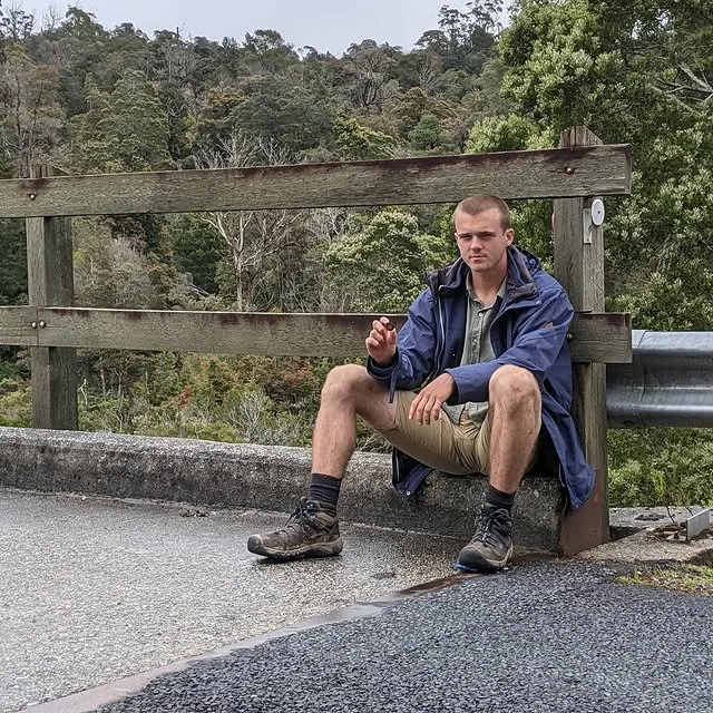 Young man sitting on a roadside curb with a forest in the background, wearing hiking boots, khaki shorts, a gray shirt, and a blue jacket, looking at the camera.