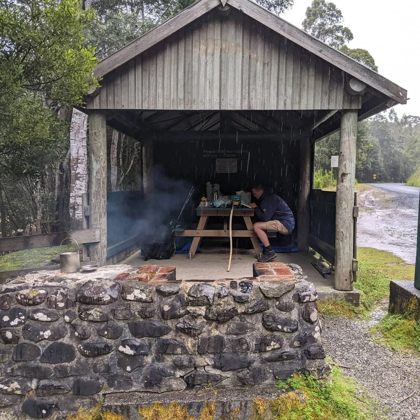 A person sitting at a picnic table inside a wooden shelter near a rural road on a rainy day.